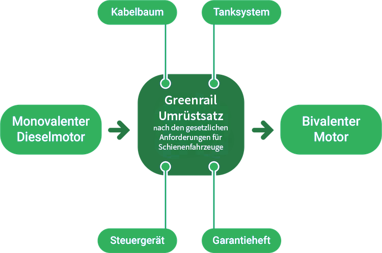 Wir rüsten Schienenfahrzeuge, LKW, Schlepper und Binnenschiffe auf den zusätzlichen Betrieb von BIO-LNG (LBG), BIO-CNG (CBG) und LPG um. Zusätzliche Eindüsung von H2 ist möglich. Somit sind Bestandsfahrzeuge wirtschaftlicher denn je.